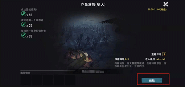 在规定的开启时间内,进入后点击”前往“,会有相关温馨提示,各位幸存者可以在出发前准备一下备战物品,点击“前往仓库”,准备需要的物资带入到游戏内。