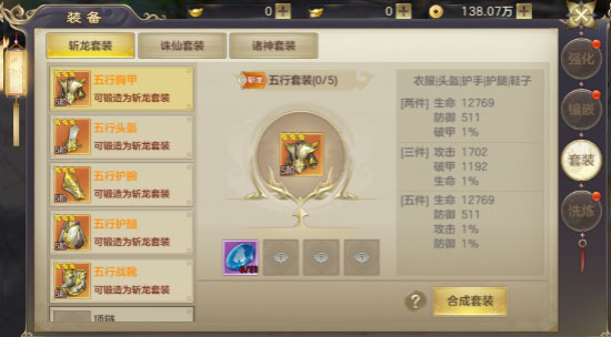 1、装备套装打造:套装分为斩龙、诛仙、诸神这3种套装。