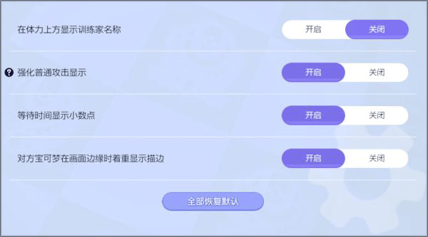 在体力上方显示训练家的名称:建议关闭,不要被与游戏无关的信息干扰。