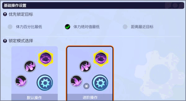 锁定模式选择:一定选择【进阶操作】,如果你之前一直用默认,现在也改过来,攻击键左下角的按键用于补刀,抢野怪非常好用。