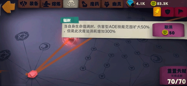 说一下这个天赋的思路,看起来是减少我们的生命值,但是我们通过高回避就避免了来自敌人的伤害,而吸血以及攻速够快又是能够保证我们基本上可以达到满生命状态。那么我们其实等于白嫖技能释放条件、攻速,同时又是将AOE技能范围扩大到很大,通过这个套路在很长一段时间内我们可以做到无伤战斗。