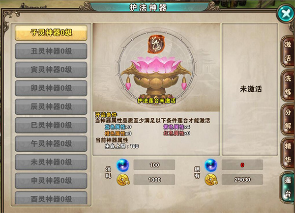 已经激活了相应神器,并且当前佩戴的神器属性条目为4条,且4条属性的品质大于或等于莲台的开启条件。(每个护法莲台的强化都有自己独立的激活条件)