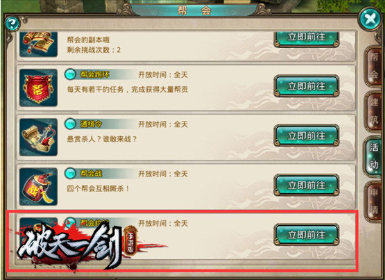 帮主或副帮主向其他帮会发起挑战,对方帮主或副帮主应战后,双方帮会成员即可在限定时间在野外进行PK,无需开启“杀”模式。攻击/被攻击目标只为发起挑战或者接受挑战帮会成员,不会攻击其他玩家。击杀后不增加恶值。