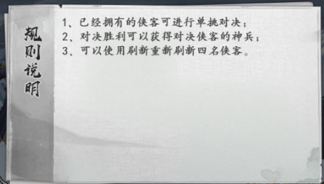 1、已经拥有的侠客可进行单挑对决;