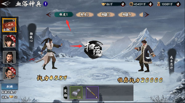 10、玩家也可以手动刷新左侧边栏的侠客来挑战并获取不同侠客的专属神兵;