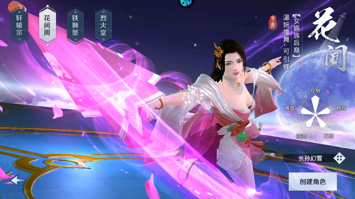 游戏中有四大职业,分别是:轩辕宗,花间阁,铁狮堡,烈火堂,每个职业不但有着独特的外形,并且职业特性与技能也有各自的特色。