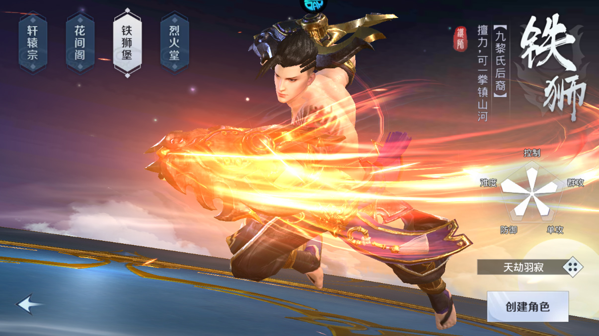 游戏有四大职业:近战群攻的轩辕宗、远程辅助的花间阁、肉盾输出的铁狮堡,还有远程群体输出的烈火堂。每个职业都有独特的技能和玩法,选择起来挺有乐趣的。战斗系统很丰富,策略性强,玩起来不会觉得单调。