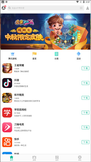 2、软件有着推荐、游戏、软件、发现四个模块,在推荐中有着腾讯游戏、首发、分类、活动等功能,以及大量的游戏和应用: