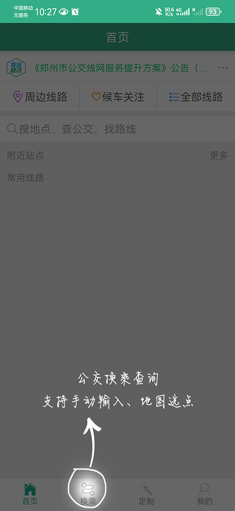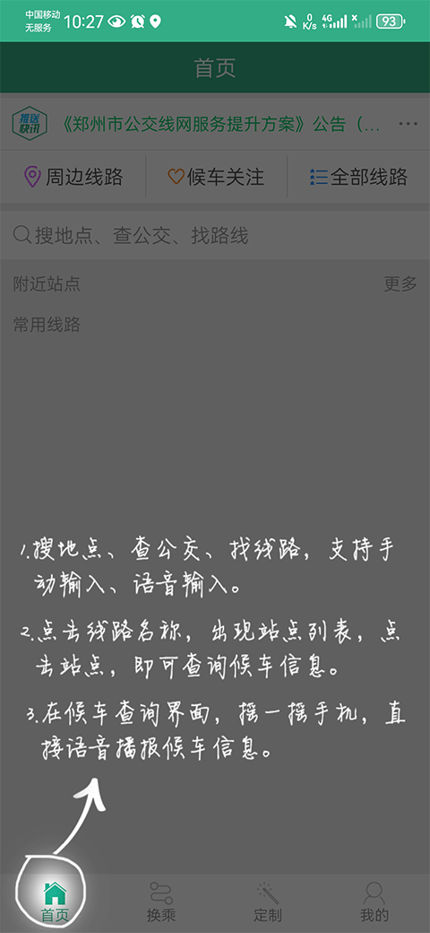 1、打开郑州行app,在首页搜索框中输入你要乘坐的公交车号码,或者需要到达的目的地