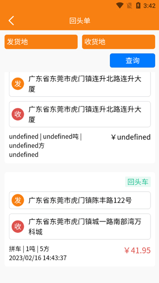 2、点进找回头车,司机可以通过输入发货地和收货地进行订单的查询