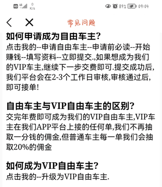 交完年费即可成为我们的VIP自由车主,VIP车主在我们APP平台上接的任何单我们不再抽取一分钱的佣金,但普通车主每一单我们会抽取20%的佣金。