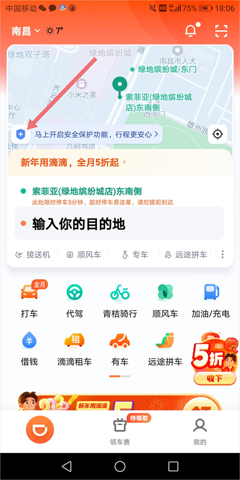 1、打开并登录滴滴app,进入页面后点击页面顶部左侧类似蓝色盾牌的小图标(下图红色箭头所指)