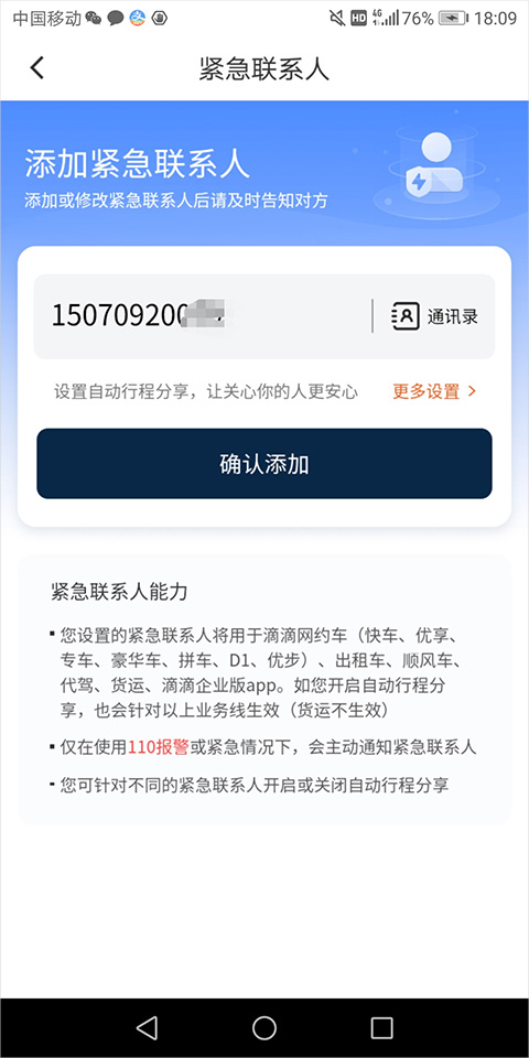 3、在打开的新页面中,输入紧急联系人电话号码,或通过通讯录进行查找添加