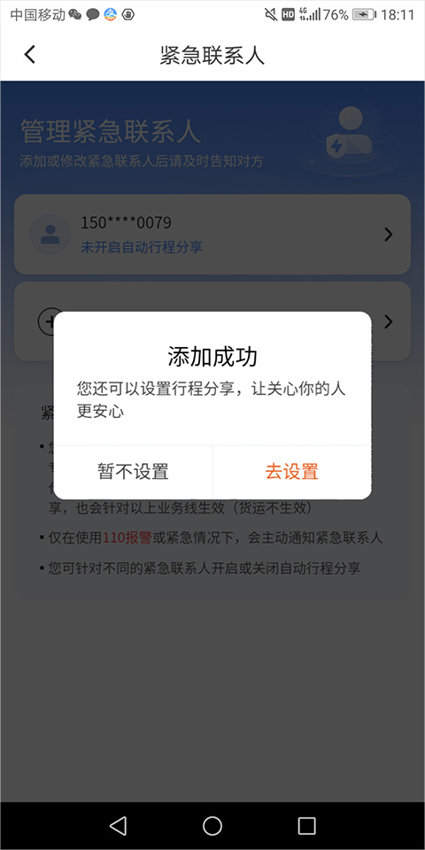 4、添加后还可继续点击【去设置】,可设置行程分享,让关心你的人更安心