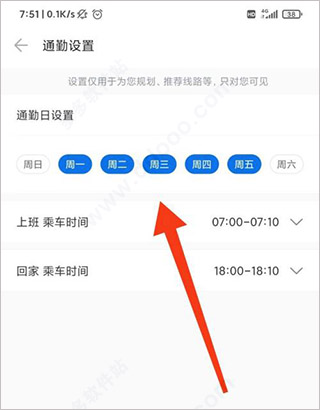 4、接着在具体设置页,先点击通勤日设置,选择要通勤的时间,比如周一到周五