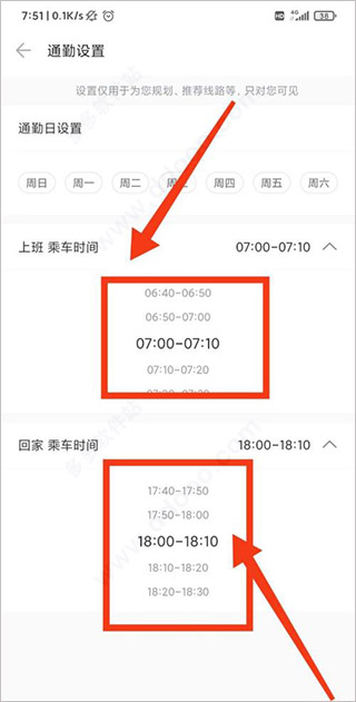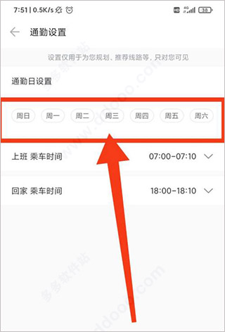 5、我们勾选通勤日后,再点击下方的上班乘车时间和下班乘车时间
