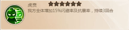 虎贲:曾经的神级将台,披着红色将台外衣的超暗金将台,反杀神器,后因过度强横被策划大刀一挥,直接砍回红色将台水平。从原来的额外增加闪避值,到现在的增加闪避概率,虽然是大砍,但依旧是不错的将台,配合蔡文姬推那种打不过的关卡会有意外收获。