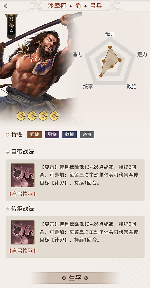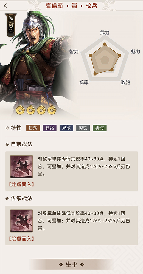 自带的战法和传承战法非常的强大,强度不亚于橙卡的,如果你有了夏侯霸的话,最好是选择他,并且如果你用不上他的话,可以拆了换技能也是非常的不错的;