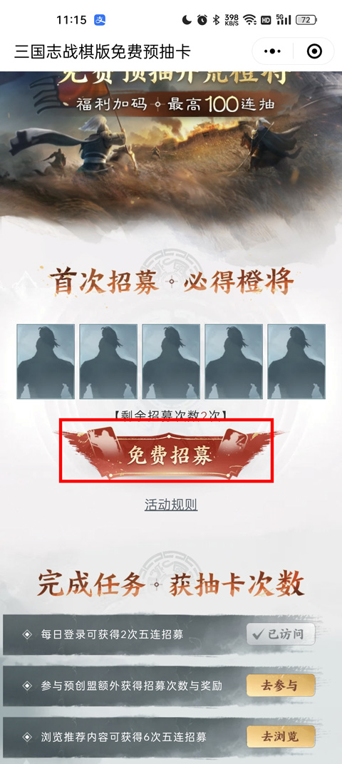 4、当玩家完成任务之后,就直接点击上方的“免费招募”,就可以获取相应的阵容了。