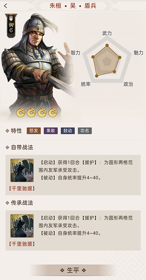 签到第二天会赠送曹仁,所以盾兵是不缺的,但是朱恒的战法是启动战法,可以援护突入敌方的队友,还有加了大量的统率,上场和拆分都是不错的。