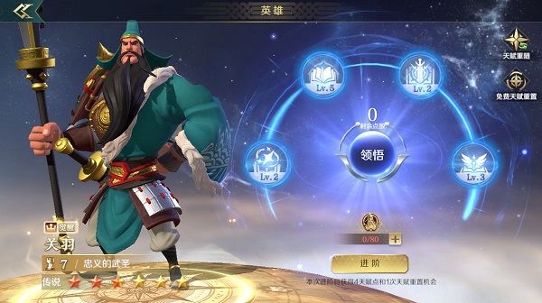 觉醒以后才能进阶,每进阶一次会使英雄的半颗星转为红色,当一颗星由没有红色转为半颗红星的时候,可以获得10点自由属性点,可以由玩家选择加在哪一项基础属性,想要英雄输出高点,可以视英雄是什么输出类型加力量或者智力,想要武将更能抗伤害一些,则可以选择加点防御,想要抢先手发动攻击则可以加敏捷。目前英雄最高五十级,每十级增加十点自由属性点,这些属性点同样是由玩家自行分配的。