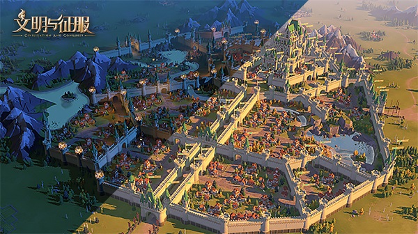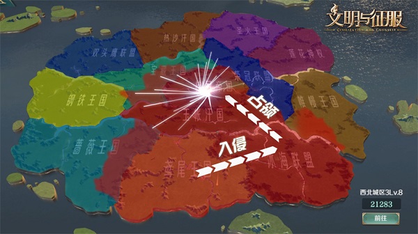 区别于市面上SLG游戏常见的一整张平铺地图,「文明与征服」全面革新了联盟大沙盘地图连地机制,创造性地将120km*120km超大地图划分为城邦、行省、王国、世界四级。沙盘方格内别有洞天,每个沙盘都是个正六方形,与周围六块沙盘相连。联盟为了攻占某一特定目标,需要经过前期的铺路,通过占据小沙盘中的据点实现占地,直到与攻占目标接壤后方可攻而占之。同时,从世界边缘到世界中心,战场层层扩张,征战永不停歇,领主们会逐渐接触到更高等级的沙盘。如何在与其他联盟、领主的沙盘决斗之中占据高地,以最少的资源达成既定目标,只等领主们来游戏中一探究竟。