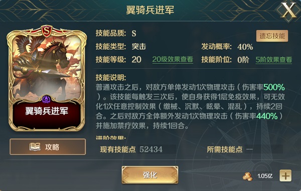 萨拉丁核心技能,500%的高额面板,发动三次后额外获得一次免疫效果,和对敌方全体发动440%的物理攻击。超高伤害还赠送免控效果,为突击技能天花板。