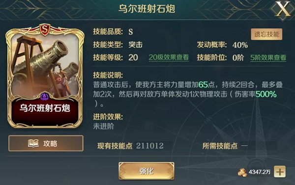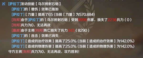 萨拉丁阿尤布鹰之团和连击姿态高频率的普攻多次触发乌尔班射石炮,吃上130点的力量加成,最后翼骑兵进军对敌方全体爆表输出!