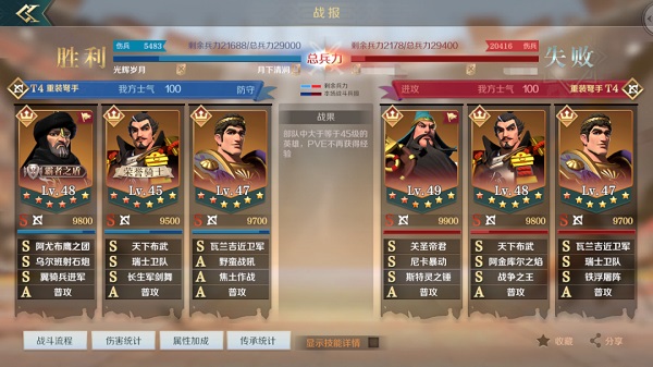 那么在整个国战的过程中,建议玩家打架的时候只给主力部队携带最高级兵,其他的挂件部队只携带T1T2即可,原因是该游戏PVP能分出胜负的结果就是看兵损。打仗的输赢不重要,重要的是同样的国与国的兵力,谁能最先在当天把敌对方的兵力吃光,谁就基本赢了,而不是看部队每回合的胜负。假如你发现你的主将被对手秒了,不要灰心,先看看双方的兵损,假如对方的兵损比你多,那就是你赢了。