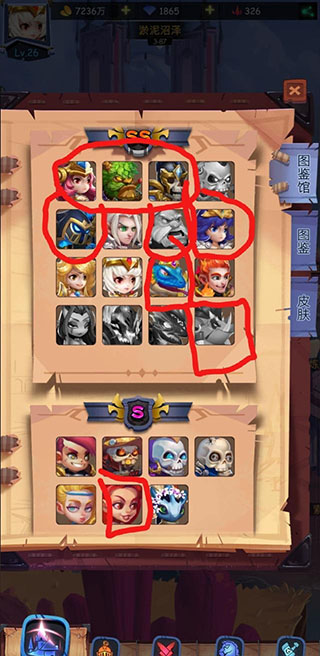 有用的英雄都已经用红圈圈出,前期这些英雄推图够用了。物理系的布鲁斯和罗杰