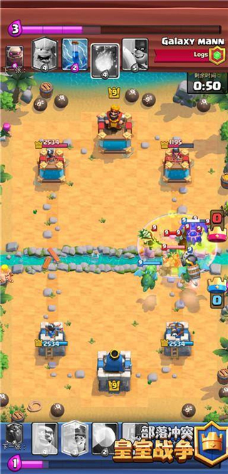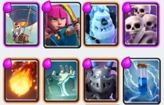 巨人气球兵组合,这也是一套曾经最强的推进卡组之一,利用肉盾巨人给气球兵开路,直奔对手防御塔,滚木和小闪电的圣水消耗都是非常低的,对辅助气球兵和巨人非常的有用,有野蛮人和弓箭手,小亡灵,对空对地的防守都不弱。