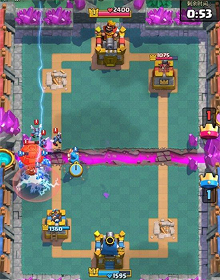 值得一提的是,该作打破传统回合制的卡牌对决玩法,采取3分钟对决模式,这点与部落冲突中的夜世界类似,在三分钟之内双方都能自由选择卡牌对战,不过要注意的是游戏的地图是双路线,并且沿用2、5D拟真对战,因此在放置部队是要留意对手兵种的前进方向。三分钟的极爽对决搭配上游戏出色的配音效果,让玩家无论在何时何地都能进行一场皇室战争的畅爽体验。