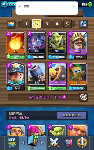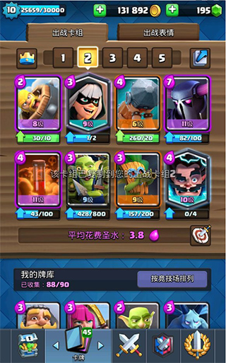 玩家可以从自己的牌库中选择8张卡牌来组成玩家自己的“出战卡组”,玩家最多可以保存三套出战卡组,然后选择一套想要出战的卡组。在对战界面点击“对战”搜索对手,匹配系统会为玩家搜寻与玩家奖杯数相近的其他玩家,玩家拥有的卡牌数等级并不会影响对战匹配。