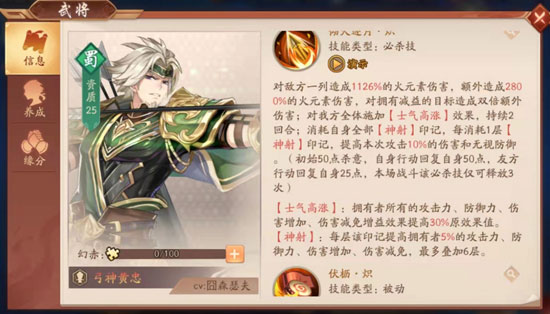 简介:马孟起大杀四方不久,体力欠佳,老将黄忠及时登场,攻守兼备,老骥伏枥!作为赤金时代此刻的输出核心组,赤金2武将每一个都不会让人失望。黄忠的输出类型有别于马超,虽然不像马超可以多次出手,灵活多变,但神射印记累积下的黄忠,依然老当益壮。神射印记所积累的攻击力以及伤害增加的提升,让黄忠的必杀伤害可以一剑封喉。这时候有玩家会跟小编吐槽:小编!黄忠的伤害也没有你说的那么夸张嘛!世上没有哪位武将不经过培养就可以达成完美的效果。经过培养的黄忠,额外伤害就可以达到4000%!此时还并未计算其他加成,同时被动可以帮助这位老将在被控之后,获得高达100%的免控,可以让这位老将不会持续被控,安稳出手,提供稳定输出,避免赤金时代控制繁多,作为输出核心,被摁住无法还手的尴尬局面,老而弥坚,稳定可靠!还有谁会小瞧这位射盔报恩的老将!【士气高涨】为团队带来的全面的提升,以及经过培养后,黄忠可激活的【鼓馁旗靡】效果,对敌方全方位的遏制,为黄忠带来了更优越的输出空间。五虎上将,并非浪得虚名!
