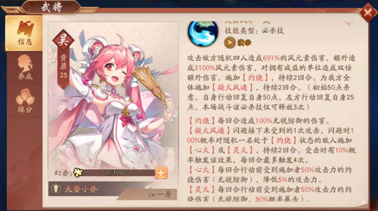 简介:东吴二乔之一再现人间。从金品质进阶到赤金以后,这位闭月羞花的美少女,竟然也学会了“煽风点火”。风元素的伤害,作为赤金2时代的武将,如出一辙的对于具备减益的敌军,有双倍额外伤害。同时这“点火”继承了“东吴纵火犯”的历史优良传统,效果也随之更上一层。首先基础的【灼烧】不再跟大家赘述,东吴玩家实在过于熟悉了,无视防御的回合伤害。