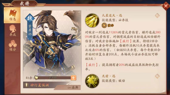 简介:夏妙才,名门之后,并非如常人眼中,是纨绔子弟,而是千载难逢的良将帅才。【疾行】的存在,作为一个赤金品质的效果,对于赤金武将施加的减益也会生效哦,有效的降低团队被减益与控制带来的困扰,让友军具备更优的输出空间,而不是全员列队罚站~同时可以削弱敌方对于友军的限制。或许看起来妙才的技能很简略,其实这是简单粗暴的表现。必杀技特有的全力一击的效果,可以让妙才在释放必杀技时,去消耗自身全部杀意与怒气,去为这蓄力一击带来更恐怖的输出补足。进过培养后,每多出10点的杀意,就可以提高本次攻击15%的伤害;每消耗1点怒气,还可以提高15%的伤害。这还不算恐怖吗?那么不要忘了培养成型后的夏侯渊,具备1609%的基础伤害和高达4000%的额外伤害,同时此刻谁身上没有减益状态呢?对于减益的目标还会造成双倍的额外伤害!感受到被一箭穿心的痛苦了吗?同时夏侯渊具备与众不同的杀意回复方式,奇数回合开始时,恢复200点。小编可以如此形容夏侯渊:他犹如一杆死神狙击枪,具备三发子弹,每个奇数回合就会上膛,等待将猎物一枪毙命,毫无生还的可能。将夏侯渊称之为赤金2时代输出爆发的巅峰,绝无任何异议。