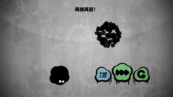 《永不言弃》的游戏画面风格采用极富创意的另类墨汁效果打造,整体色彩偏灰暗却不失明亮,因为游戏中大量运用了对比极其强烈的色彩进行搭配。此外,对于游戏的主角是一团黑乎乎只有两个眼睛的小球,虽然没有手和脚,但游戏公司也尽可能的为其设计了丰富的肢体语言和动作,以便能给玩家营造出一种极富动感的游戏体验。