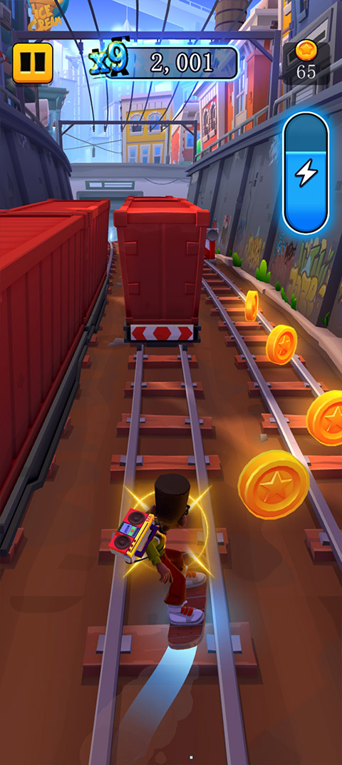 在这款游戏中,玩家将要在火车的轨道上不停的穿行,试图逃离无情的守卫,尽可能快地奔跑,收集大量硬币和惊人的威力提升,以加冕为下一个悬浮滑板英雄。当然,在奔跑的过程中,玩家会遇到各种各样的障碍,非常考验玩家玩家的反应能力和应变能力,你需要尽可能获得更高的技能,拾取更多的金币。