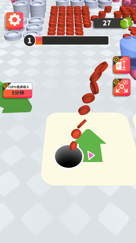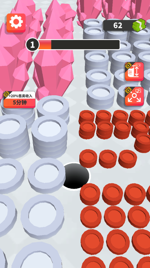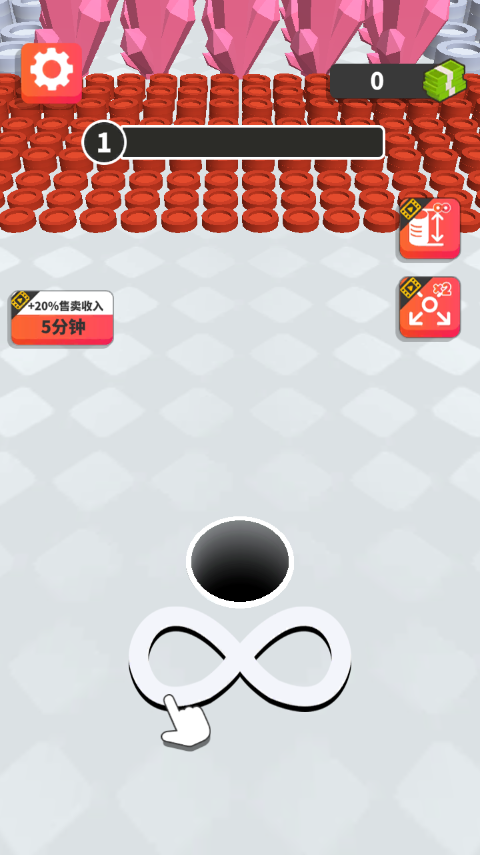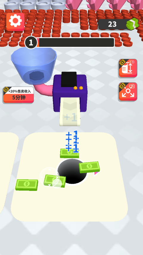 6、点击右边的选项还可以进行等级提升,提升后黑洞可以变大,可一次性收集超多物资材料,也能够制作出更多的钞票,当游戏界面上方的能量条满了你就可以进入下一关了,接下来更多有趣精彩的玩法就由你们自行去探索了。