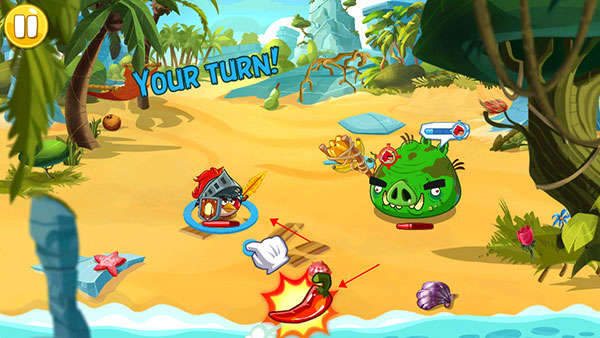 在游戏中玩家将操控自己的角色与敌人进行对抗,本作的战斗采用了回合制战斗模式,玩家可以直接用手指以划线的方式指定攻击目标,每个小鸟、捣蛋猪都具有不同的属性,长按小鸟或捣蛋猪即可查询它们的特性。