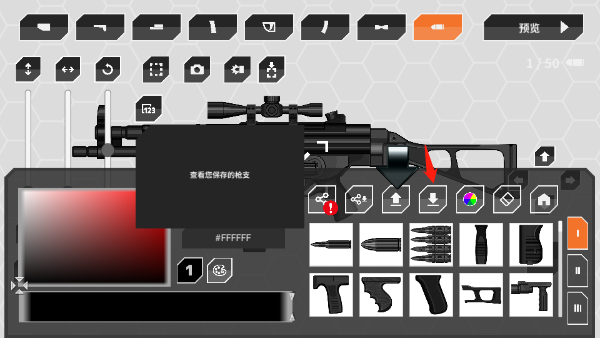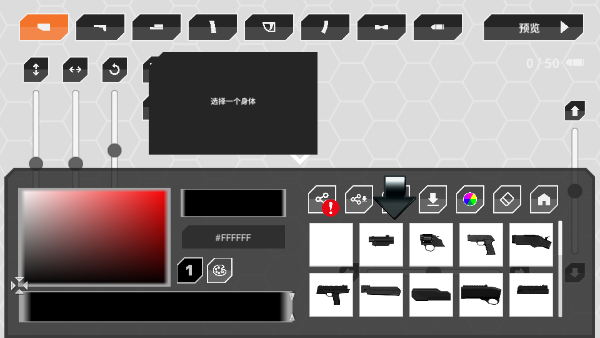 6、对了,你还可以点击左边的滑板设置枪的颜色,点击预览可查看该枪的整体形象。