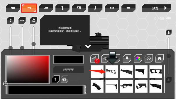 4、选择一个枪股,如果你想射击的枪不需要这个,你就可以不要选择它,接下来依次点击枪的各个部位来设置一款独属于自己的枪型。