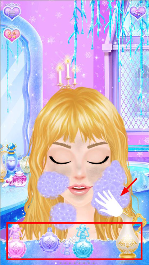 1、打开公主沙龙之冰雪派对中文版,进入美轮美奂的冰雪王国,首先来做一个舒适惬意的皮肤护理吧,冰雪王国的宫廷spa屋里,充满了各种冰雪元素;