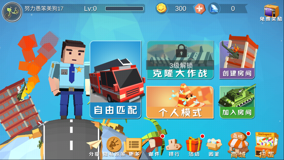 3、游戏一共有五种模式,自由匹配、个人模式、加入房间、创建房间和克隆人大作战,注明一下克隆人大作战是要3级才能解锁的哦