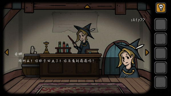 这里我们就可以点击莉莉的床,就会睡觉度过一晚了。来到第二天,安娜就说莉莉不见了的对话,对话结束后,我们就点击她的魔法书,多点击几下就可以翻页获得火柴,左边的木桶上还可以获得太阳魔法卷轴。