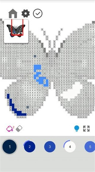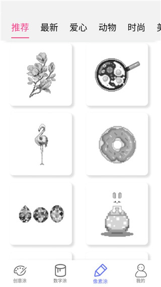 3、像素涂:像素风的图片,每个像素都有对应的颜色和数字提示,另有颜料桶等一键涂色多区域。 涂色完成后的图片都可以保存或分享。