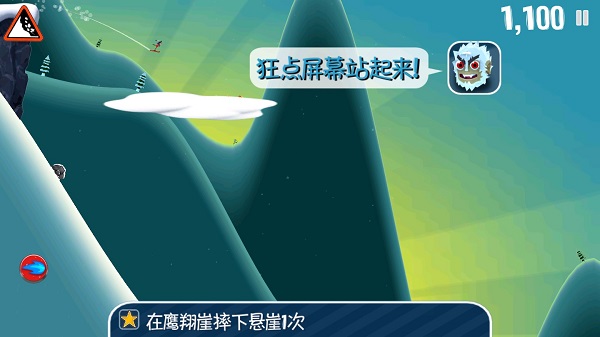 屏幕左侧上方的雪崩警示牌会在雪堆即将接近时不断地闪烁以示警告,即时你已经在视野中能够看到背后奔腾而来的大雪,如果此时爬起继续滑行,那么甩掉这近在咫尺的雪堆也并非不可能。