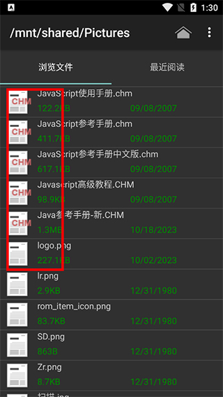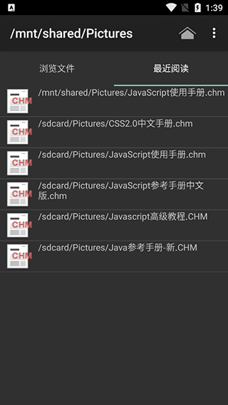 用户打开应用就可以在浏览文件中查找手机里的chm文档