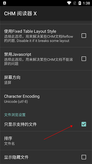 应用会自动显示可以展示的chm文档,因为应用默认只展示可显示的文件