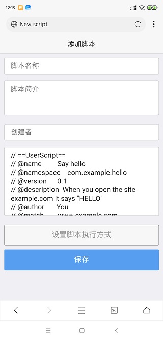 前往浏览器设置》浏览器脚本》点击右上角的”添加脚本” 按钮, 选择 ”新建脚本“。 然后,把把代码粘贴至 “javascript代码” 编辑区域 点击保存即可。对于符合规范的油猴脚本,无需填写“脚本名称”、“脚本简介”等字段,浏览器会自动从元数据中提取这些信息保存。